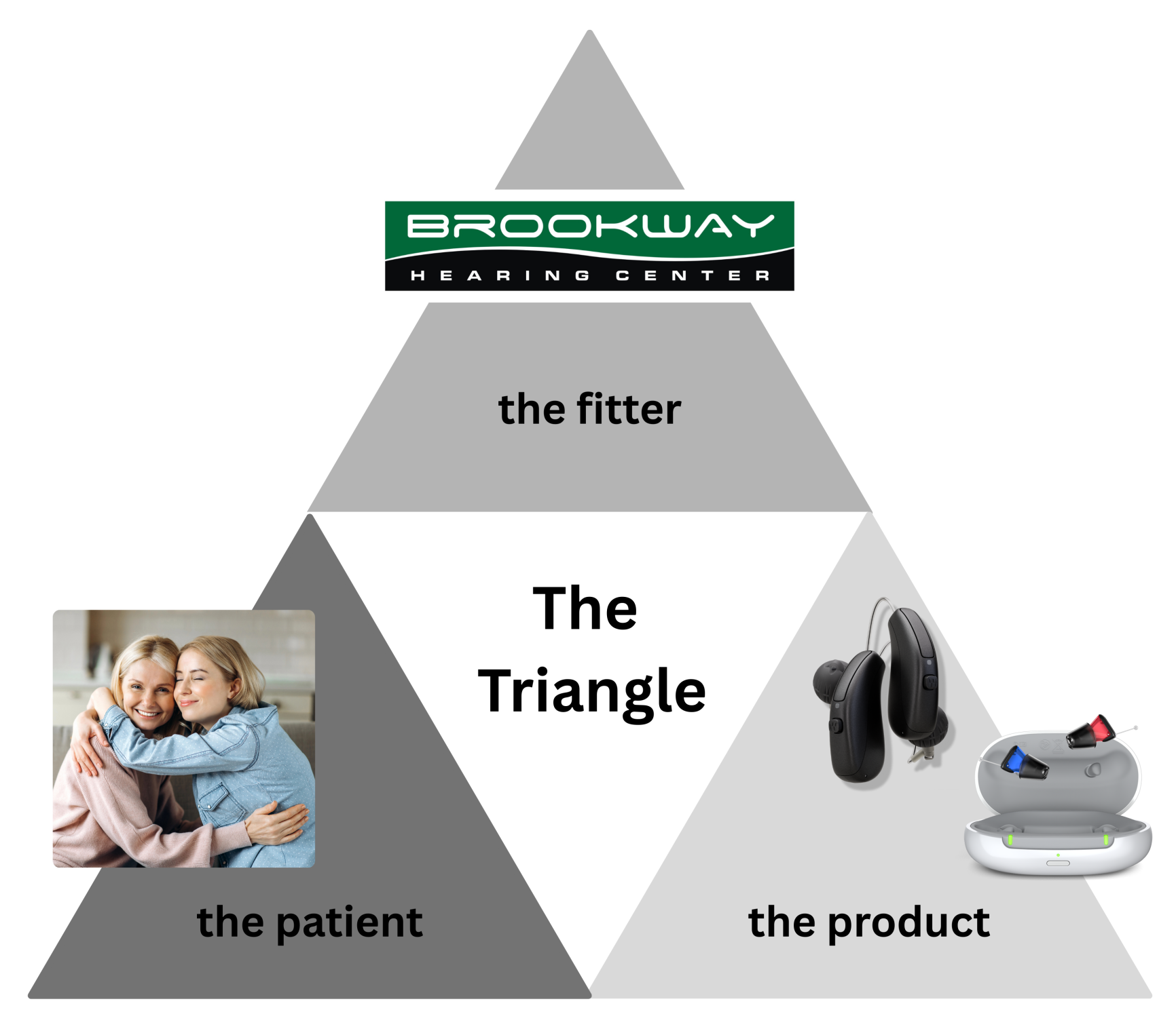 We believe that optimal hearing health is achieved when the fitter, the product, and the patient work together harmoniously—a concept we refer to as "The Triangle." This collaborative approach ensures that each component supports the others, leading to the best possible outcomes for our patients.